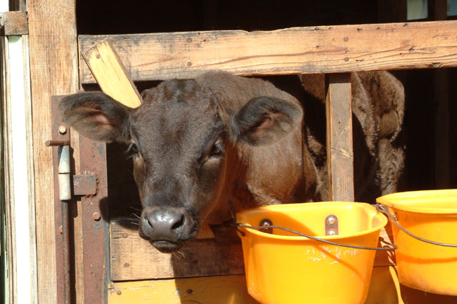 | 牧場には今年もかわいい子牛がいました。私の車が通ると怖がって顔をひっこめるのですが、しばらくするとオッカナビックリ顔をのぞかせます。この子牛ももうすぐ大人の牛と一緒の柵の中に移されるでしょう。 |