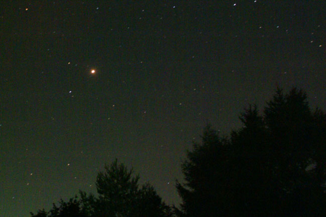| 火星が地球に大接近しています。北軽井沢は星がきれいで、晴れれば満天の星空ですが、その中でも今は火星がひときわ明るく輝いています。金星とちがって火星は外惑星(太陽から見て地球よりも外側の軌道を周回する惑星)なので、一晩中観測できます。日暮れのあとに南東の空に明るく見えているのが、火星です。マイナス2等と非常に明るいので、都市部でも見られます。 |