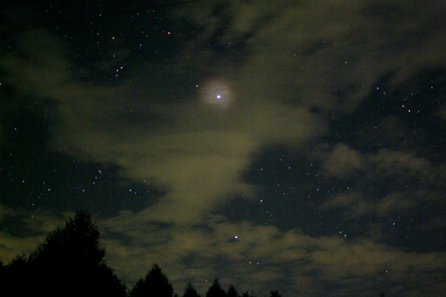 | 夜半から薄雲が出てきました。普通の星はこんな雲でもすぐに隠れてしまいますが、驚いたことに火星は、周囲の雲までもを照らして燦然と輝いていました。まるで映画「ベン・ハー」のキリスト誕生のシーンのようでした。こんな光景はもう一生見られないでしょう。 |