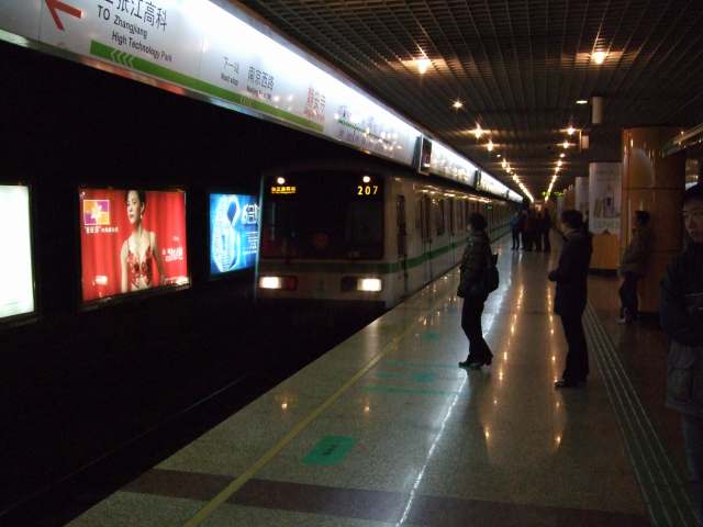 | 地下鉄駅ホーム 上海は今地下鉄網が急速に発達しています 料金も30円程度で 本数も多く 非常に便利です これは地下鉄2号線(東西線) 千代田線のような車輌でした 車内は清潔で安全ですが 物売りや物乞いが多いです |
