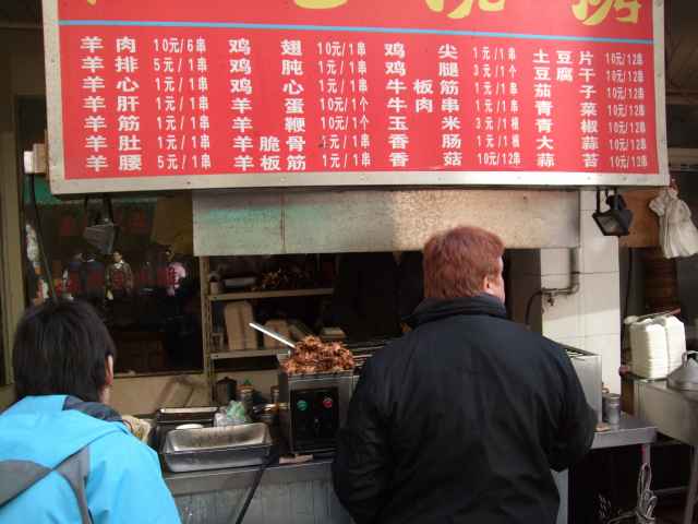 | 串焼き屋さん 漢字表記なので何となくわかります (わからないのもあります) 私は6串10元(約150円)の羊肉串を食べました スパイシーで かなりキてる味でした タコも人気です タコ串は「八爪魚」といいます |