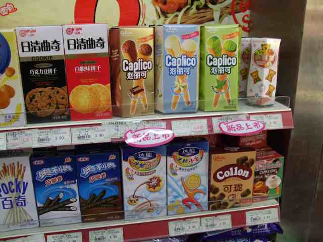 | コンビニ(便利店)のお菓子売り場 日本のお菓子が大人気です クッキーは「曲奇」 ポッキーは「百奇」 コアラのマーチは「小熊餅」といいます |