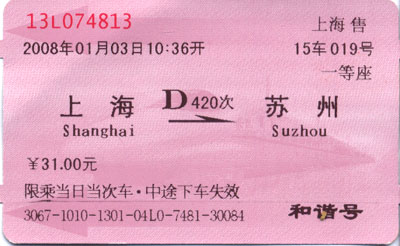 | 上海→蘇州の超特急(新幹線)切符 窓口はオンラインで簡単に買えました 座席も指定されています 一等車でも31元(約470円)と日本の10分の1以下の料金 |