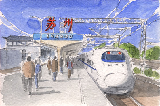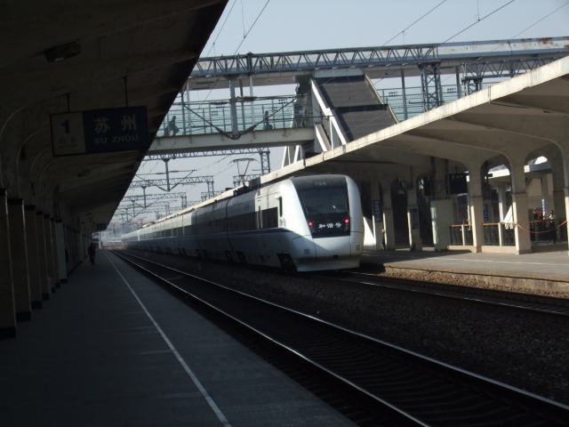| 蘇州駅到着 どこから見ても 長野新幹線です 蘇州駅は新幹線車輌も停まれるように ホームの一部が 一段高く造ってあります ホームが長大なので 改札まで10分もかかりました |