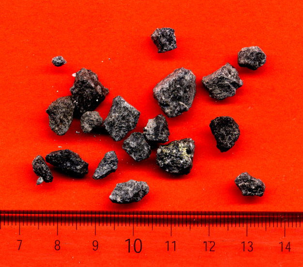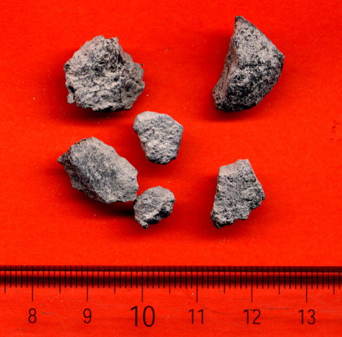 | 火山灰は1回の降雨で流れてしまいます。これは降雨後のもので、岩石の肌が見えています。 採取地;北軽井沢・栗平 自動車ボンネット上 スケール目盛最小単位はmm 採取者;橋元氏(北軽井沢・シバタエステート) |