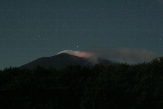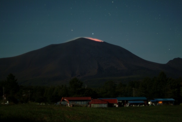 | 北軽井沢押切場にて 気味が悪いほど少ない噴煙でした。地上の風景が明るいのは、月明です。 |